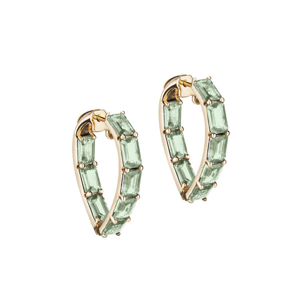 From Goshwara’s Gossip Collection, the Heart Hoops are shaped with graceful curves and edged in precision-set baguettes of prasiolite, striking the perfect balance of romance and architectural edge. The cool green tones of prasiolite are set in radiant 18K yellow gold, creating a luminous contrast that feels modern yet timeless. These hoops embody sculptural beauty and bold femininity, making them a refined statement for every occasion.