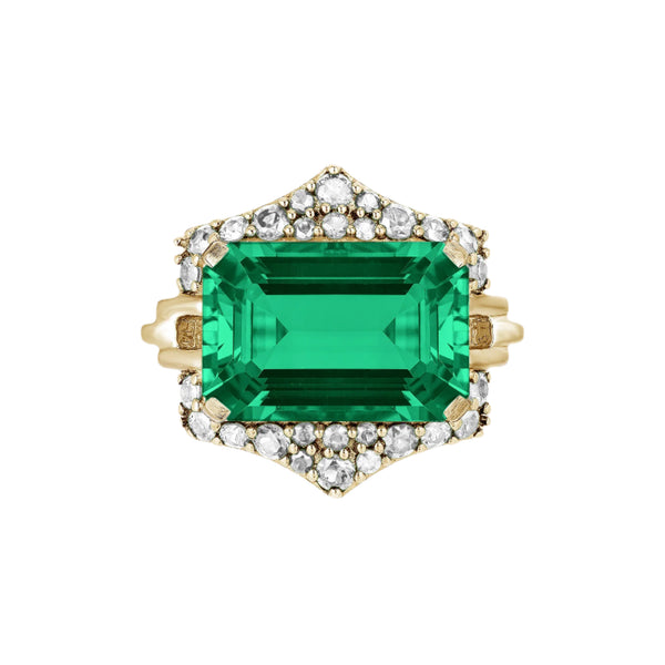 Goshwara’s Rain Forest Ring is a bold reimagining of classic luxury. Featuring a richly saturated 5.80ct emerald set east-west in polished 18K yellow gold, this vibrant green stone is framed with 0.64ct of brilliant-cut white diamonds for a radiant contrast. The unique horizontal silhouette gives the ring a modern twist, while the surrounding sparkle lends timeless sophistication, making it a powerful statement piece.