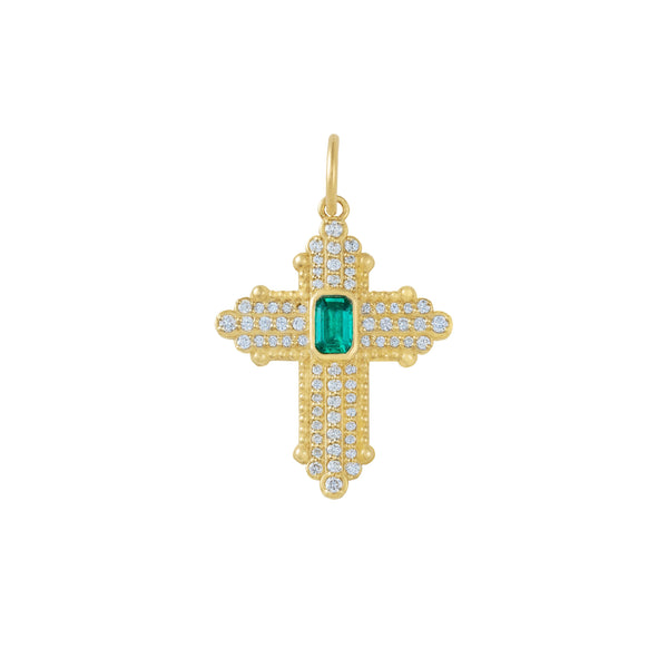 A symbol of protection and powerful grace, the “Divine Light” Cross Charm by Lionheart brings together the strength of a diamond pavé cross with the vibrant clarity of a 0.25 carat emerald centerpiece. Beaded detailing and a rich 14K yellow gold setting give this piece a refined, heirloom feel. A modern keepsake, handcrafted in New York City to be worn close to the heart—anchoring your spirit in light, love, and intention.