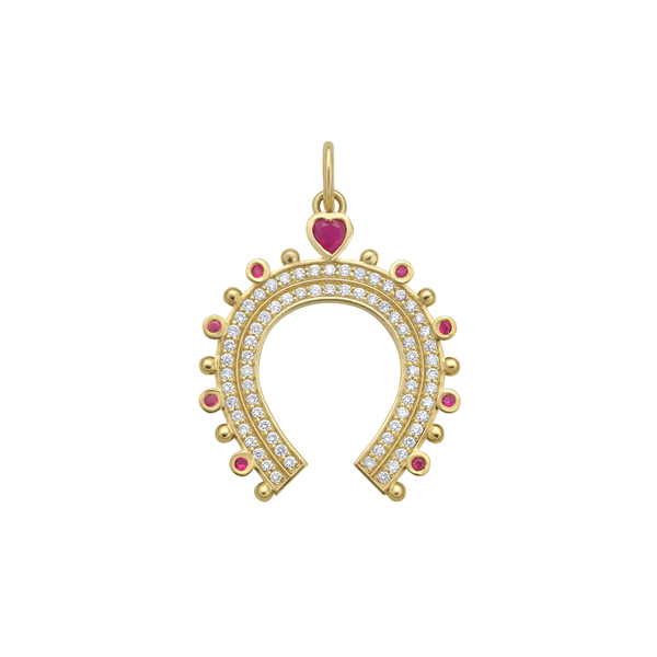 A charm for passion and protection, the Lucky Ruby Heart Horseshoe Charm by Lionheart symbolizes strength, love, and good fortune in equal measure. Handcrafted in 14K yellow gold, this design gleams with brilliant diamonds and fiery rubies — a striking balance between elegance and emotion. Wear it solo for a bold statement or layer it alongside your favorite medallions as a radiant reminder of life’s luck and love intertwined.