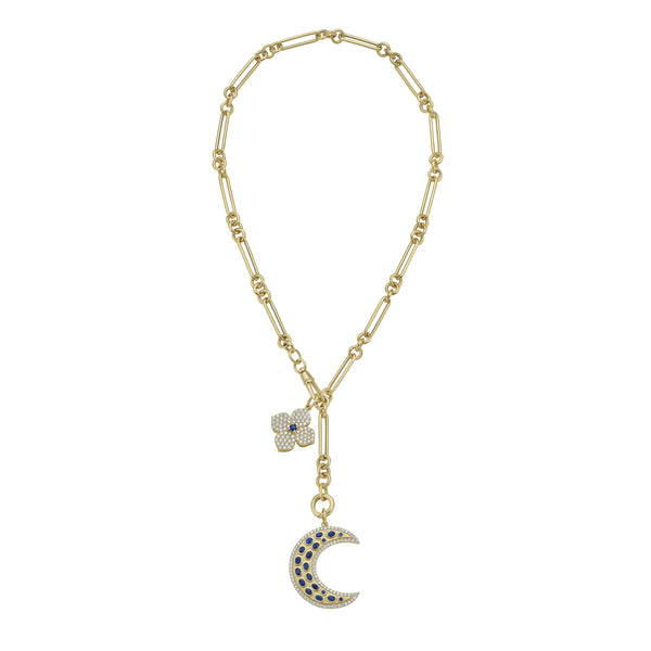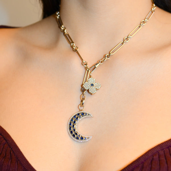 A charm born from the night sky. The Måneskin Sapphire Moon Charm channels celestial mysticism and romance, echoing the power of the moon as a symbol of feminine energy, intuition, and renewal. Handcrafted in rich 14K yellow gold, this elegant crescent is adorned with 1.20 carats of deep blue sapphires and framed with 0.50 carats of pavé-set diamonds for a quietly dazzling finish. Perfect for dreamers, stargazers, and moonlit souls—this luminous medallion was made to inspire.
