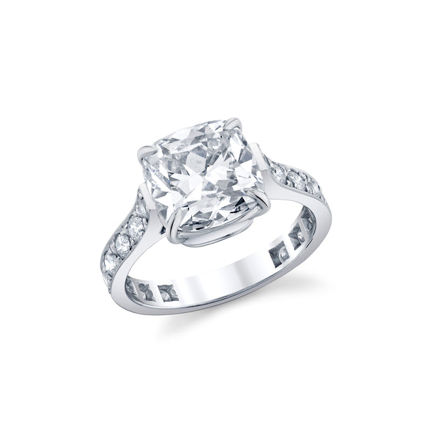This 3.20ct cushion-cut diamond ring is a tribute to timeless love. Framed by 0.58ct of round diamonds on a platinum setting, the bold cushion center glows with warmth and legacy. A statement of enduring beauty and commitment.