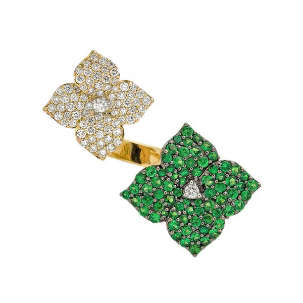Two blooms, one ring—this double flower tsavorite design feels like luck and love wrapped into one. Set with 1.72ct of vibrant green tsavorite and 0.79ct of diamonds, it’s crafted in 18K yellow gold with just enough asymmetry to keep it playful.