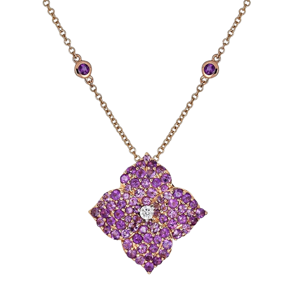 Bold and romantic, this large amethyst flower pendant is made for those who love rich color and classic design. Crafted in 18K rose gold, it features 1.70 carats of amethyst and centered with 0.05 carats of diamonds. It hangs from a 16" chain and brings just the right mix of drama and softness to any outfit.