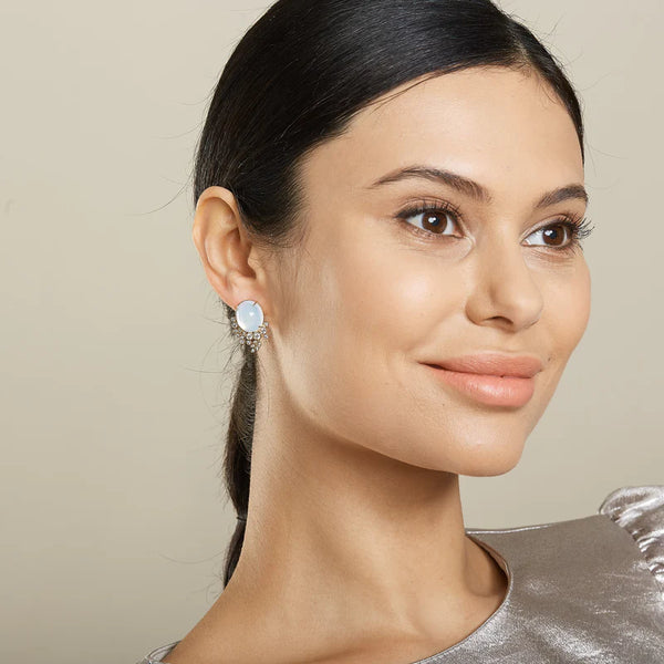 Syna Cabochon Vine Moon Quartz Earrings, Enjoy a flourishing garden no matter what time of year with our botanically-inspired vine earrings, which stun with substantial gemstone cabochons and a vine-like pattern in 18K yellow gold. Various sizes of diamonds look like dew drops sparkling in the sunlight.