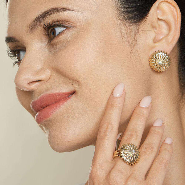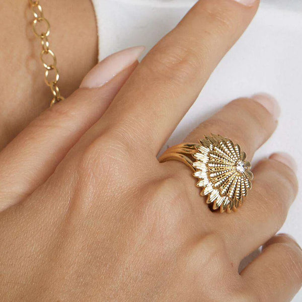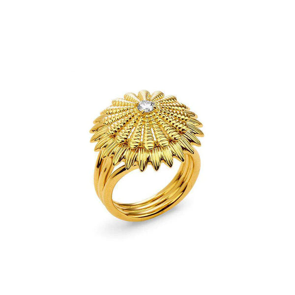 The Syna Cactus Ring transforms natural inspiration into wearable artistry. Handcrafted in 18K yellow gold, the sculptural design radiates with textured, layered detail, centering a single round diamond (~0.15 carats). With its bold silhouette measuring approx. 0.9 inches wide, this limited-edition ring embodies heritage craftsmanship, exotic inspiration, and intricate beauty.