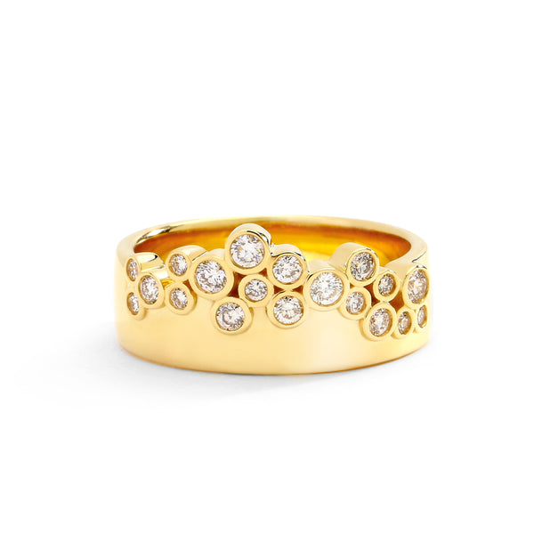 The Cosmic Diamond Band is a radiant expression of Syna’s ethereal elegance and heritage-inspired design. Handcrafted in 18K yellow gold, the band is set with bezel-framed diamonds totaling approx. 0.35 carats, scattered in a celestial constellation pattern across the surface. With its luminous gold and intricate detailing, this piece transforms everyday wear into an act of artistry—timeless, versatile, and celestial in spirit.
