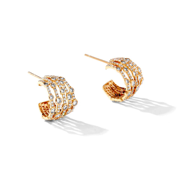 Syna Cosmic Diamond Hoop Earrings. A truly out-of-this-world classic, our Cosmic diamond hoops are a treasure to behold. Rows of 18K yellow gold are studded with pave-set diamonds and bezel-set diamonds. The sparkle from these earrings will turn heads from across the room.
