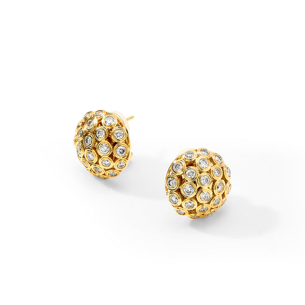 The Cosmic Earrings radiate celestial elegance in a sculptural silhouette. Handcrafted in 18K yellow gold, these luminous studs are pavé-set with approx. 2.30 carats of diamonds, creating a dome-like sparkle that captures light from every angle. Both timeless and versatile, this design reflects Syna’s heritage of blending romantic detail with ethereal refinement — an everyday piece elevated to art.