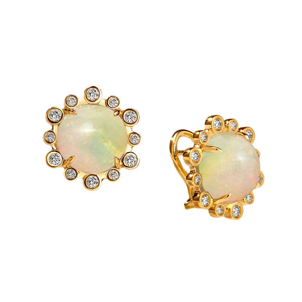 The Ethiopian Opal Mogul Studs showcase Syna’s signature blend of rare gemstones and intricate craftsmanship. Handcrafted in 18K yellow gold, these luminous studs feature vibrant Ethiopian opals encircled by a halo of sparkling white diamonds. This regal silhouette pays homage to heritage design while celebrating the natural beauty of opal’s shifting fire.
