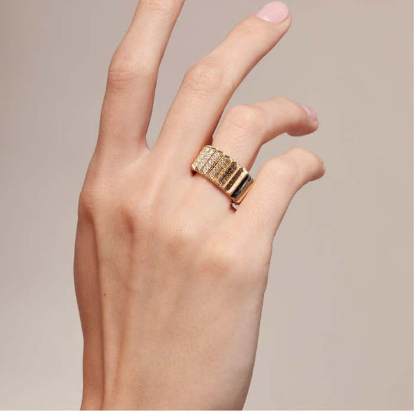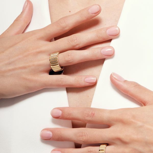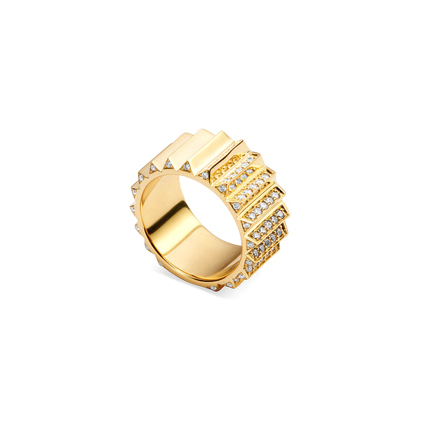 The Syna Geometrix Band redefines modern luxury with bold architectural lines and intricate diamond pavé. Handcrafted in 18K yellow gold, this striking design features geometric tiers set with approximately 1.15 cts of diamonds, balancing structure with brilliance. A sculptural piece that embodies Syna’s heritage of ethereal elegance and exotic detail, this band makes a powerful statement worn alone or stacked.