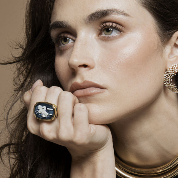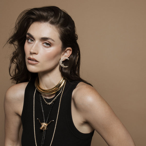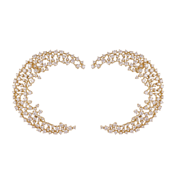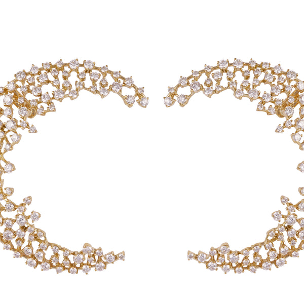 A celestial statement for the modern collector, Ananya’s Scatter Crescent Moon Hoops in 18K yellow gold showcase 3.52 carats of brilliant-cut white diamonds scattered across a sleek crescent silhouette. The design balances striking architecture with fluid elegance, delivering a shimmer that feels effortless yet undeniably opulent.