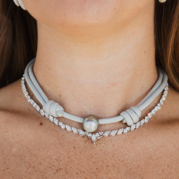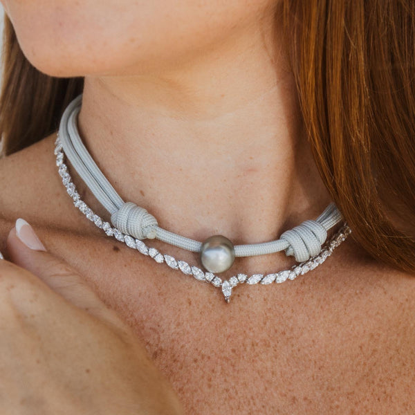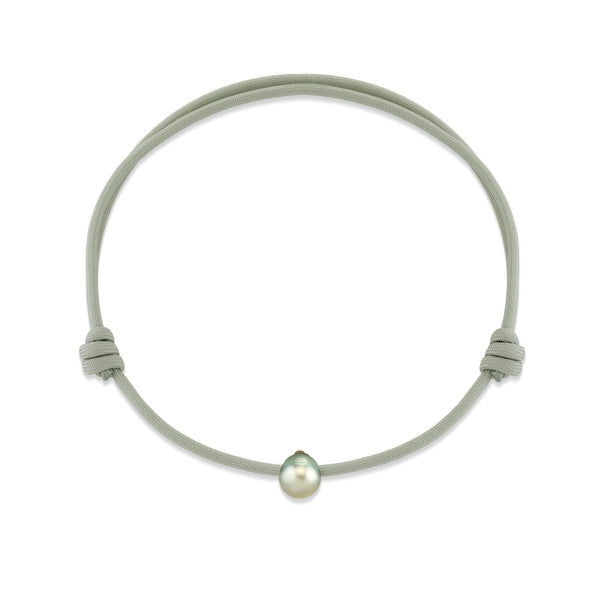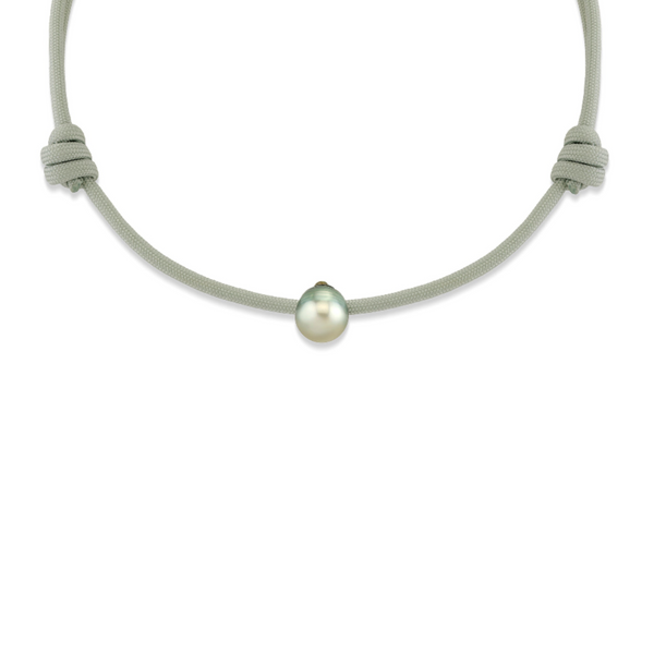 A whisper of the ocean. This Dezso necklace features a single, softly luminous grey pearl bead strung on a sage-toned adjustable cord—a minimalist expression of sea-worn beauty and everyday ease.
