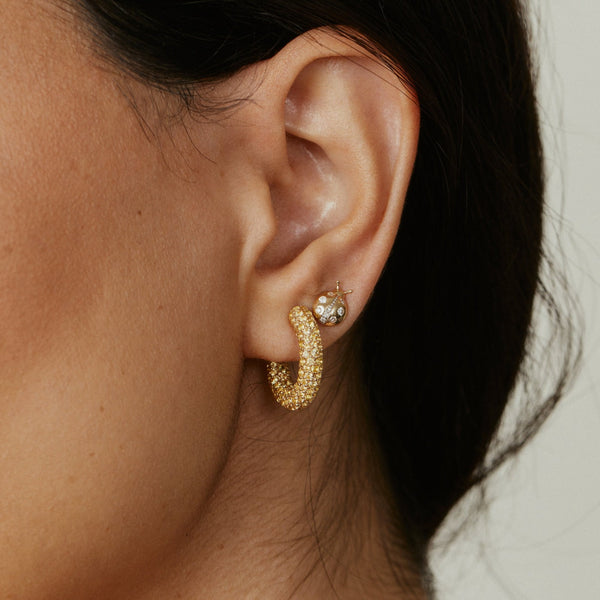 The Eriness Mini Sunshine Party Hoops bring pure joy to your jewelry box—vibrant yellow sapphires pavé-set in 14K gold for a radiant, high-shine finish. Their petite size makes them the perfect balance of everyday ease and bold, golden sparkle.