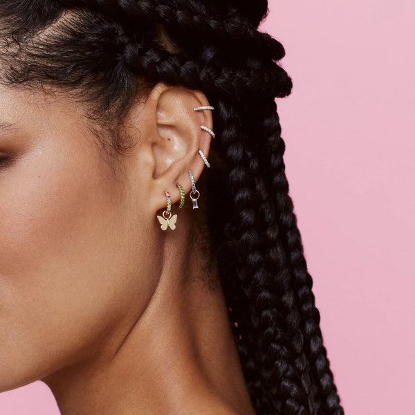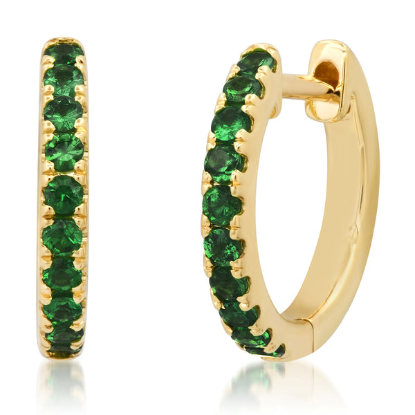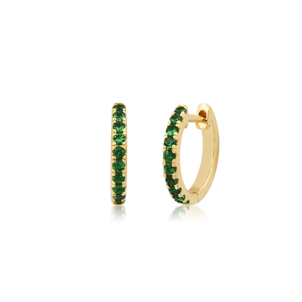 The Eriness Standard Tsavorite Huggies deliver the perfect balance of everyday polish and statement sparkle. Handcrafted in 14K yellow gold, each earring is set with vibrant green tsavorites that add a rich pop of color to any stack.