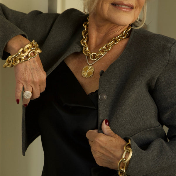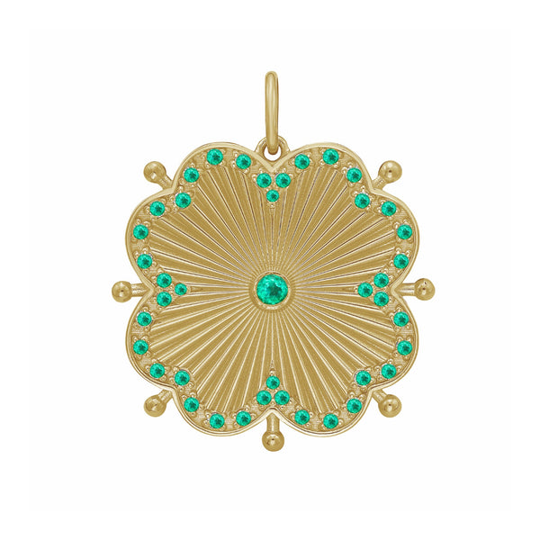 Radiating brilliance and symbolism, Lionheart’s Cassandane Mega Emerald Clover Medallion celebrates good fortune and timeless craftsmanship. Hand-carved rays bloom outward like sun-kissed petals, while vivid emeralds trace the clover’s graceful form with a halo of color and light. Set in 14K yellow gold, this signature medallion merges bold geometry with modern talismanic energy—an icon of optimism and strength.