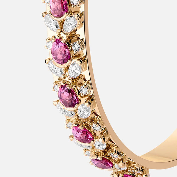 The Butterfly Keeper Bangle from Nouvel Heritage captures the soft poetry of a blooming garden, brought to life through vibrant pink tourmalines and a constellation of G-VS diamonds that shimmer like wings in motion. Crafted in recycled 18k yellow gold, its sculpted 6 mm silhouette wraps the wrist with a sense of grace and quiet guardianship, honoring the beauty found in nature’s most delicate moments.