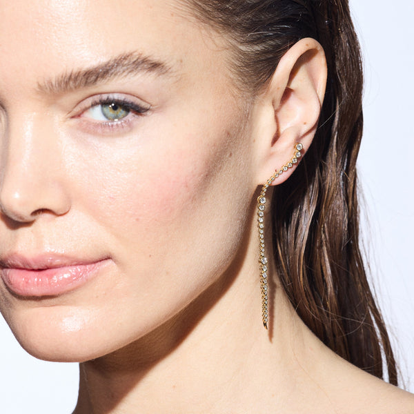 Ondyn’s Eminence Earring in 18K yellow gold commands attention—1.39 carats of brilliant-cut diamonds set in a bold, architectural silhouette. Fluid lines and luminous sparkle create an earring that feels modern yet timeless, refined yet unapologetically strong. A true statement piece, designed for those who lead with style.