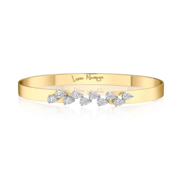 The Pear Checker Love Always Bracelet from Phillips House brings a bright, joyful sparkle to the wrist with two rows of pear-shaped diamonds arranged in a playful, light-catching pattern. Its smooth high-polish gold band curves softly around the wrist, offering a refined everyday piece infused with sentiment and modern elegance.