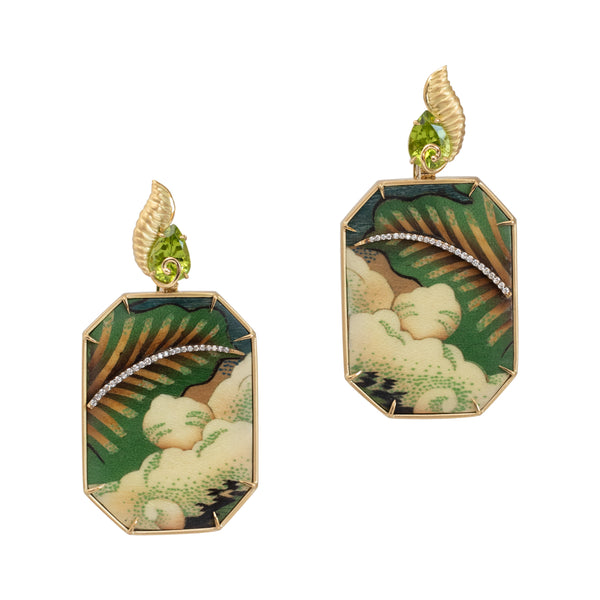 Wearing these is like stepping into a dream. Handcrafted by Silvia Furmanovich, these 18k yellow gold drop earrings showcase a lush Tibetan forest motif in marquetry—a technique as rare as the scene it captures. Accented with a leaf-like swirl of peridot (3.81ct) and dusted with 0.23ct of diamonds, the octagonal silhouette is as artful as it is powerful.